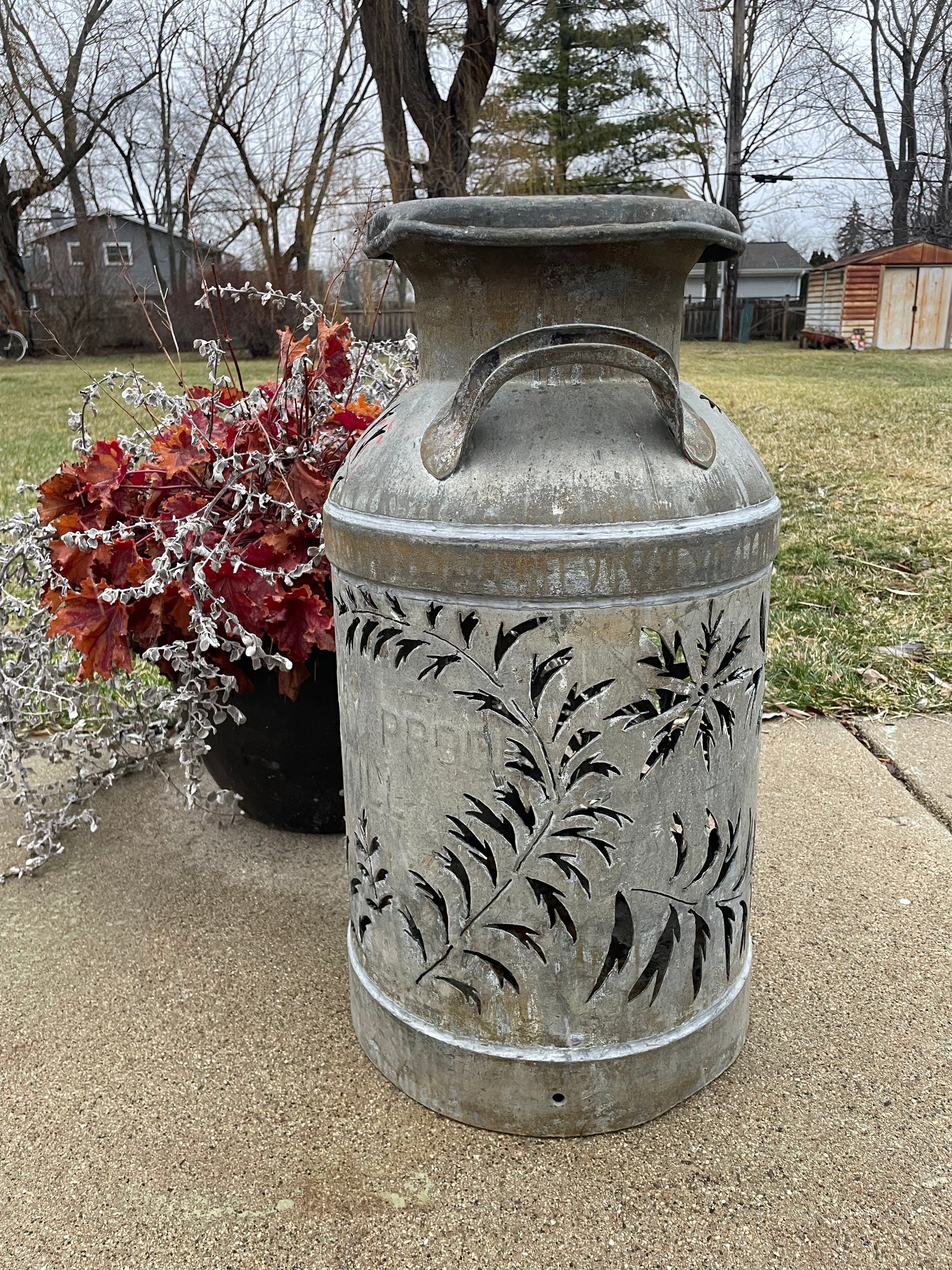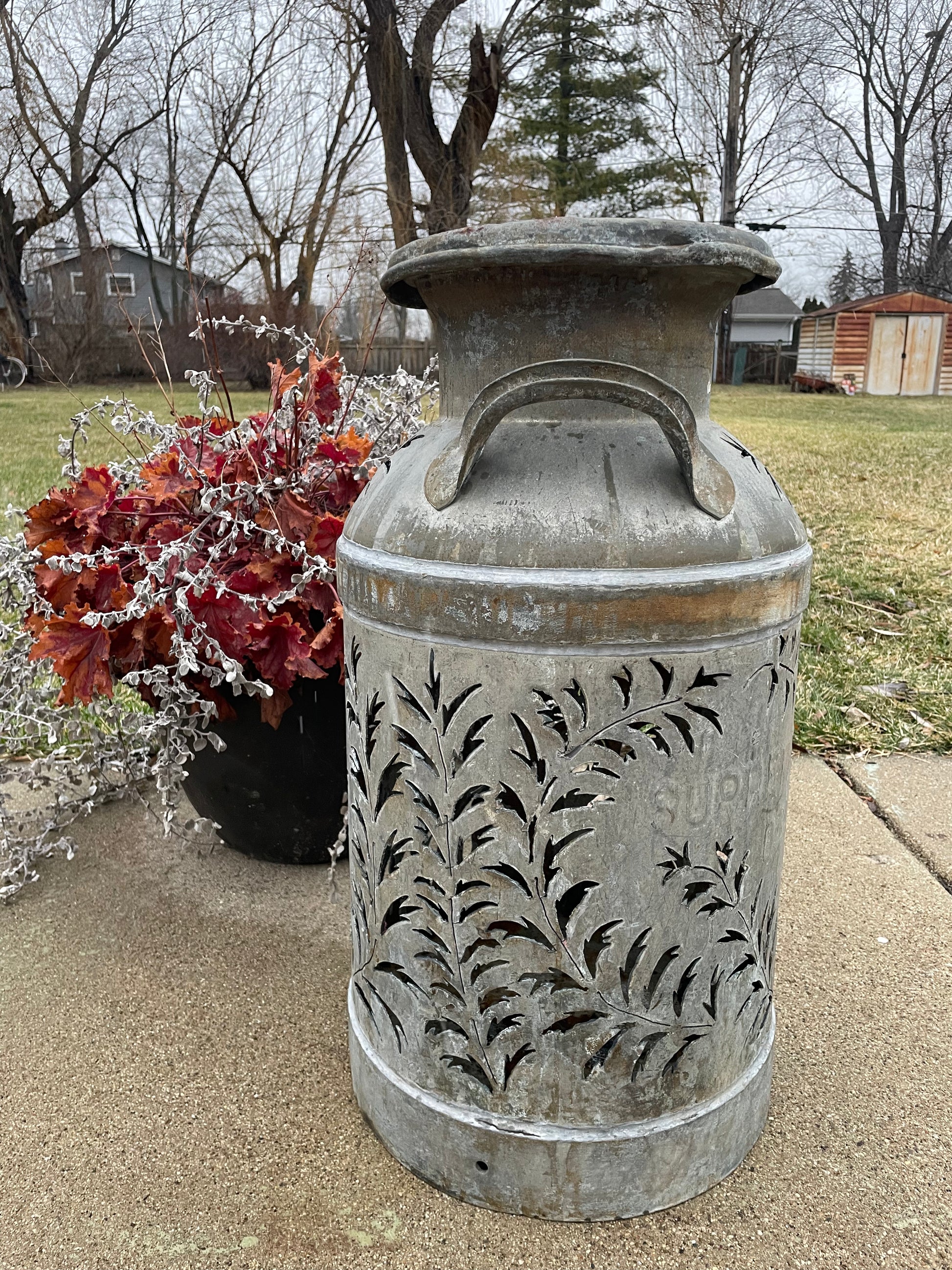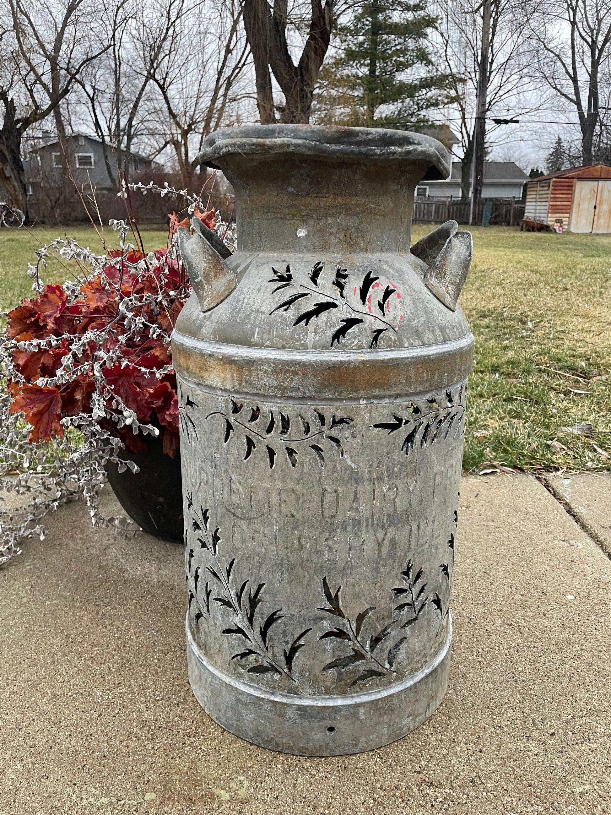 Brighten up your favorite spot with this intricately hand-cut vintage milk can.