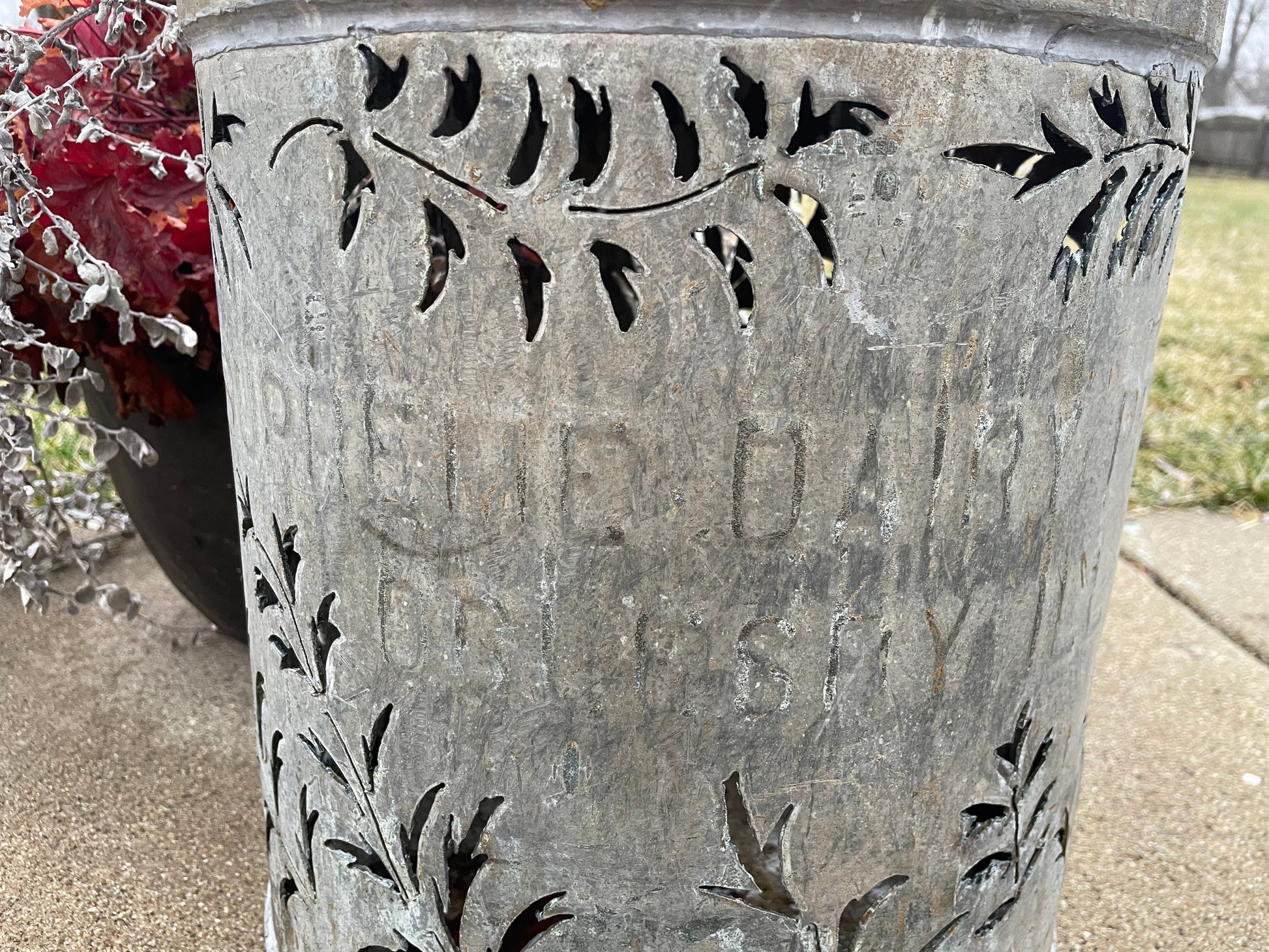 SUPREME DAIRY OGLESBY ILL is written on the side of the milk can. I did not cut over it because I thought it was important to keep this history. The top comes off so you can add a string of battery-operated lights (not included).