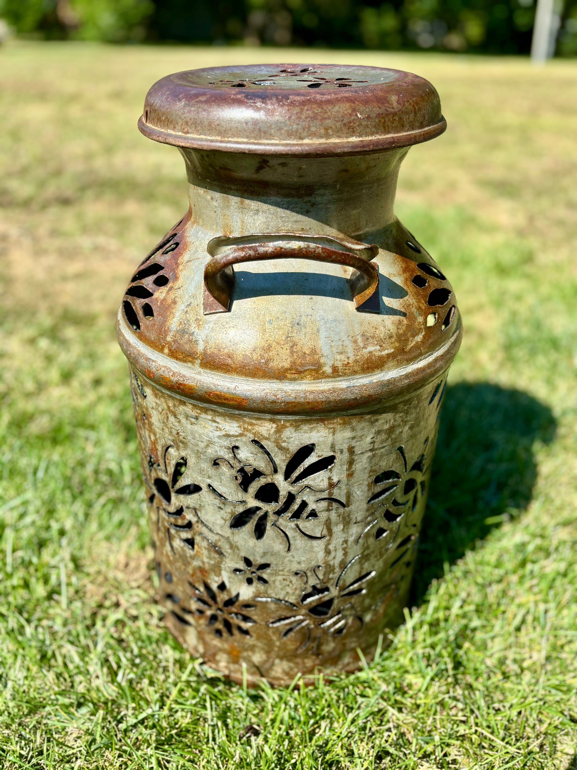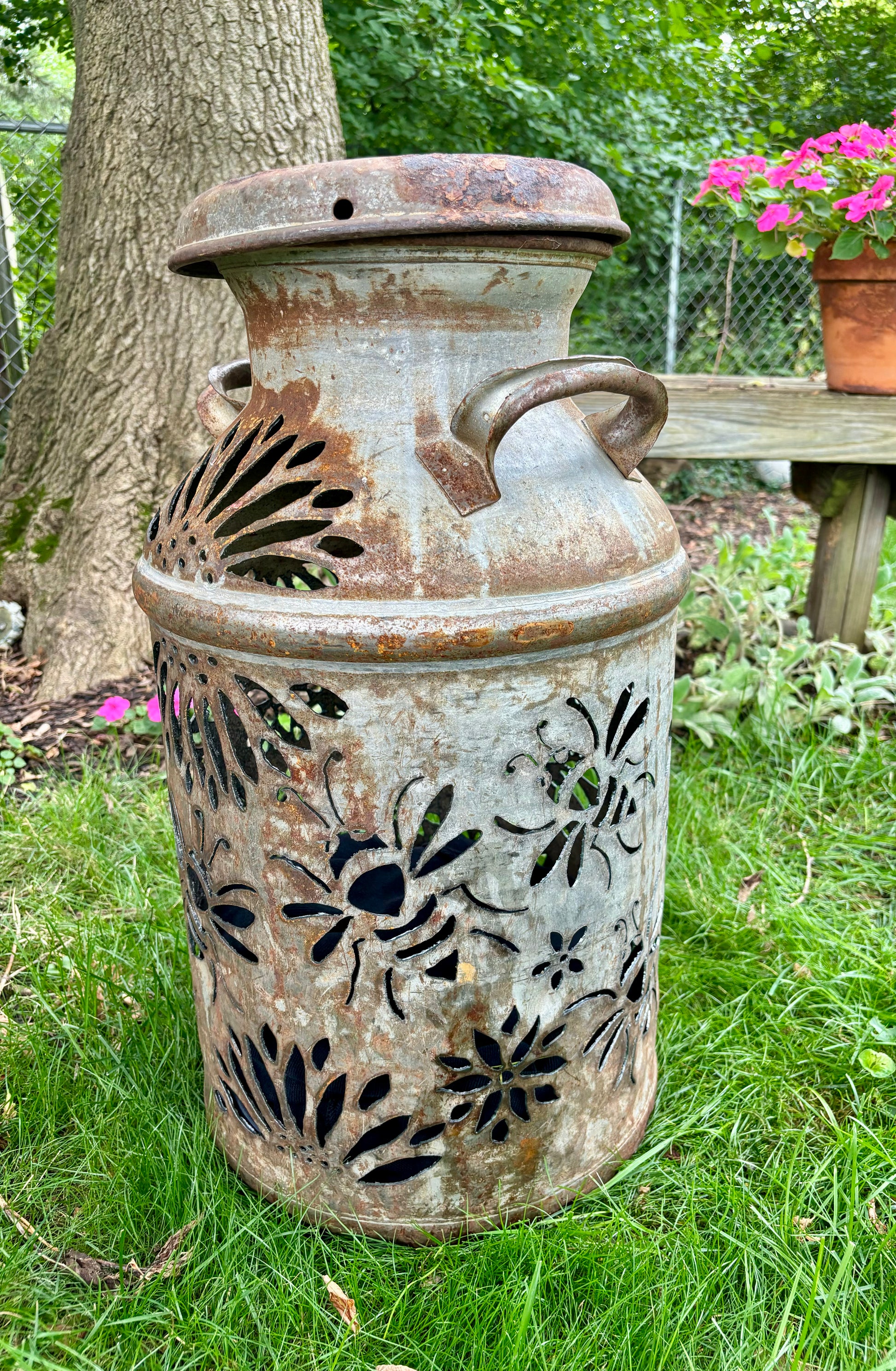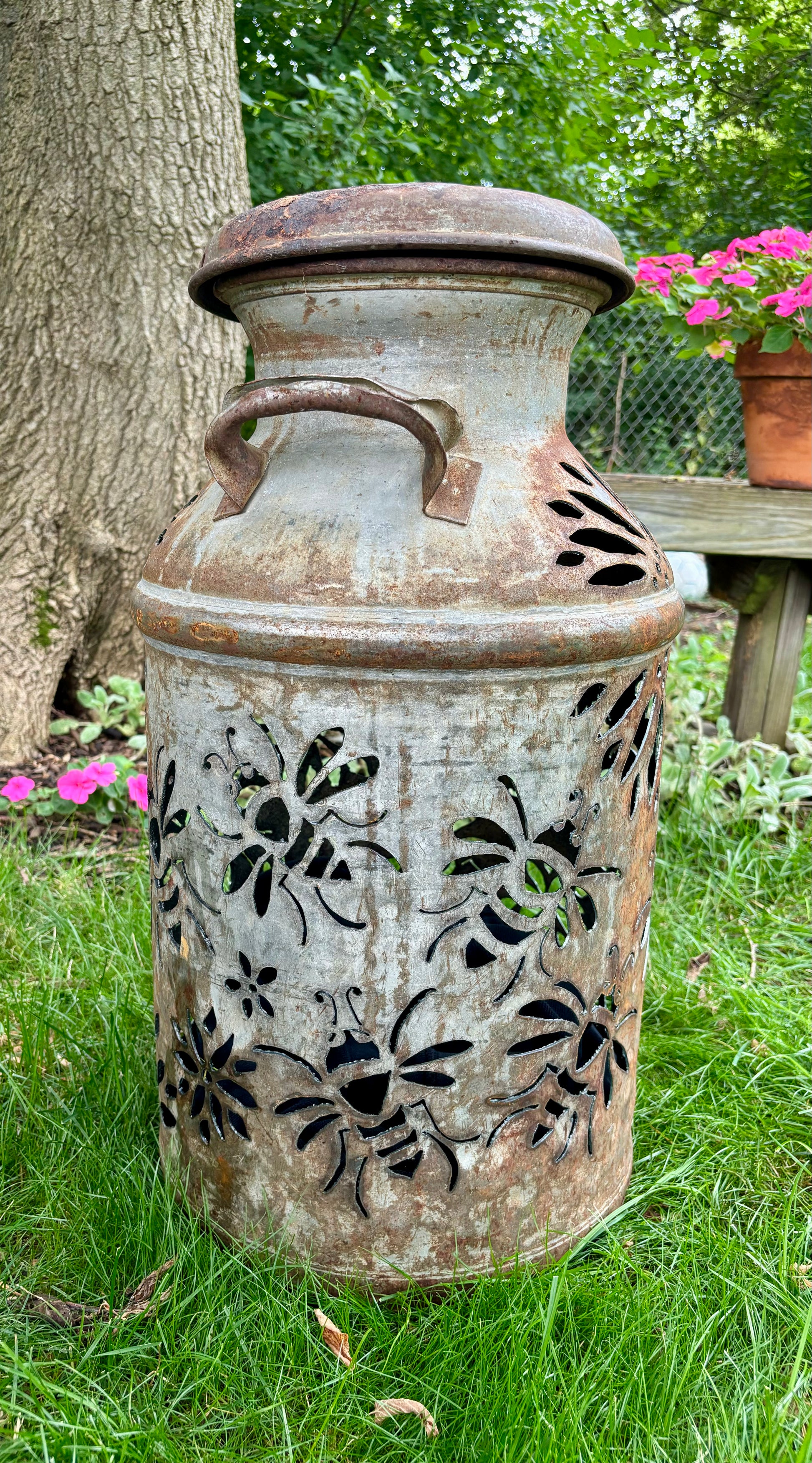 Brighten up your favorite spot with this intricately hand-cut vintage milk can with a bee and sunflower design.