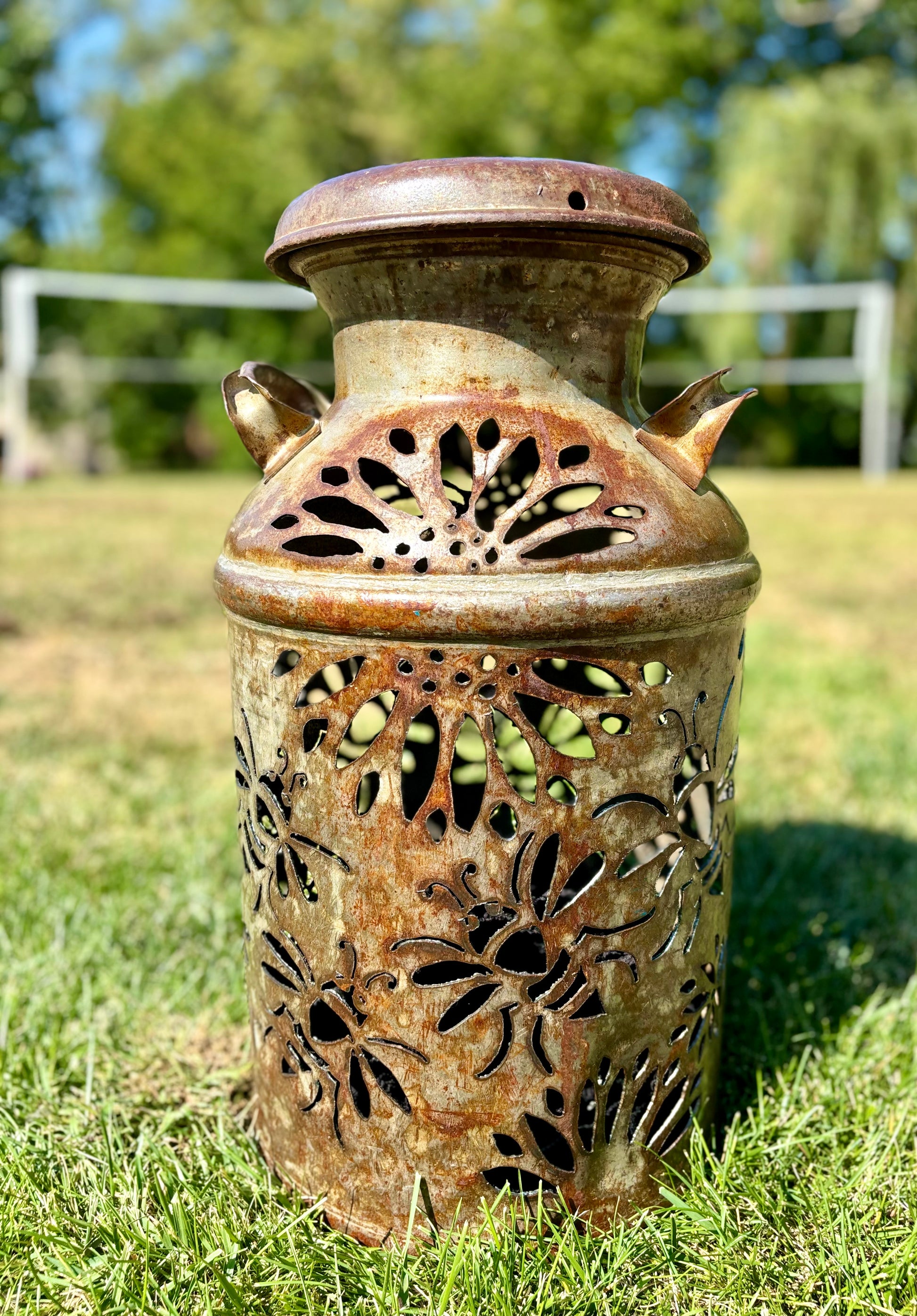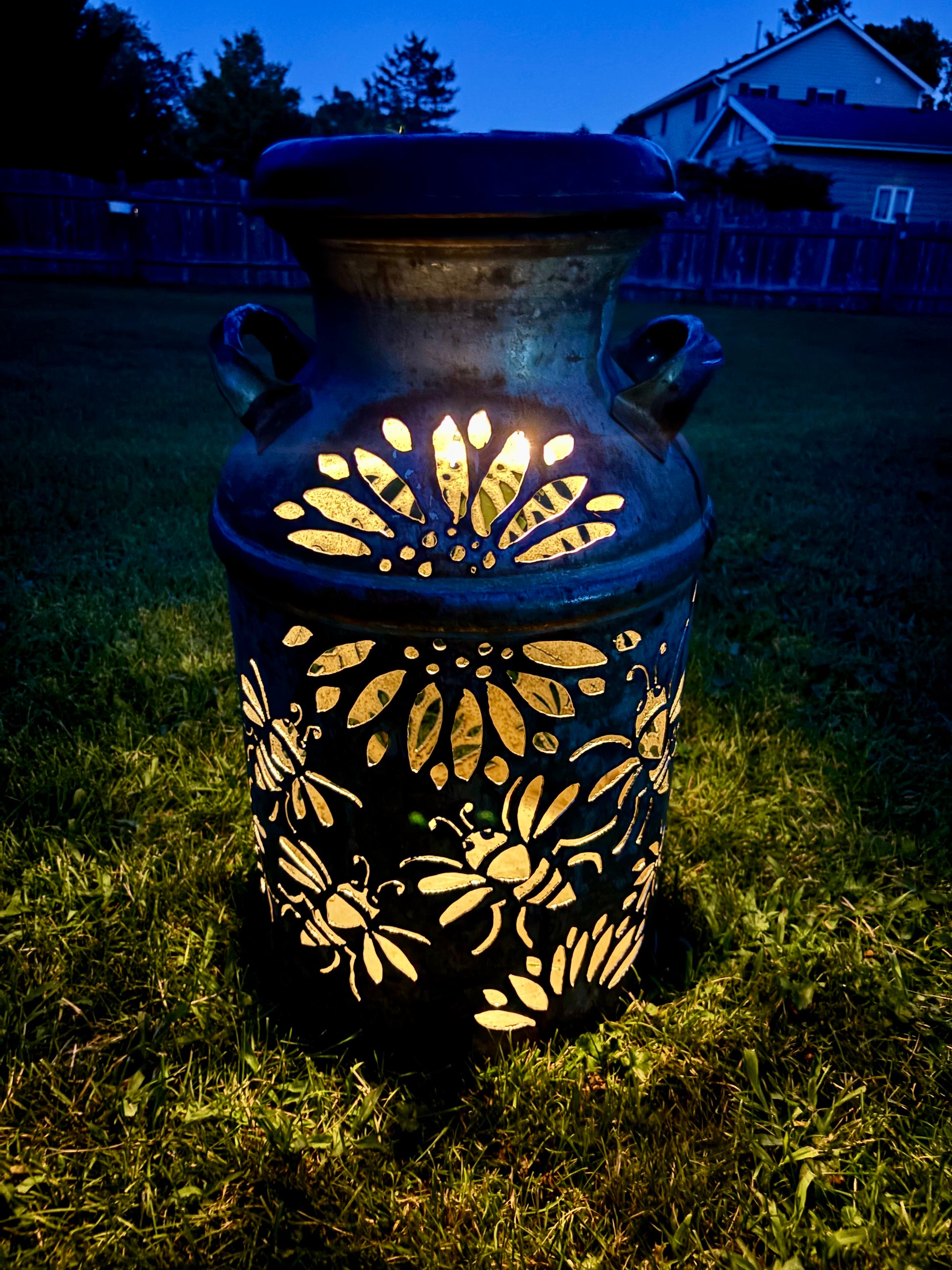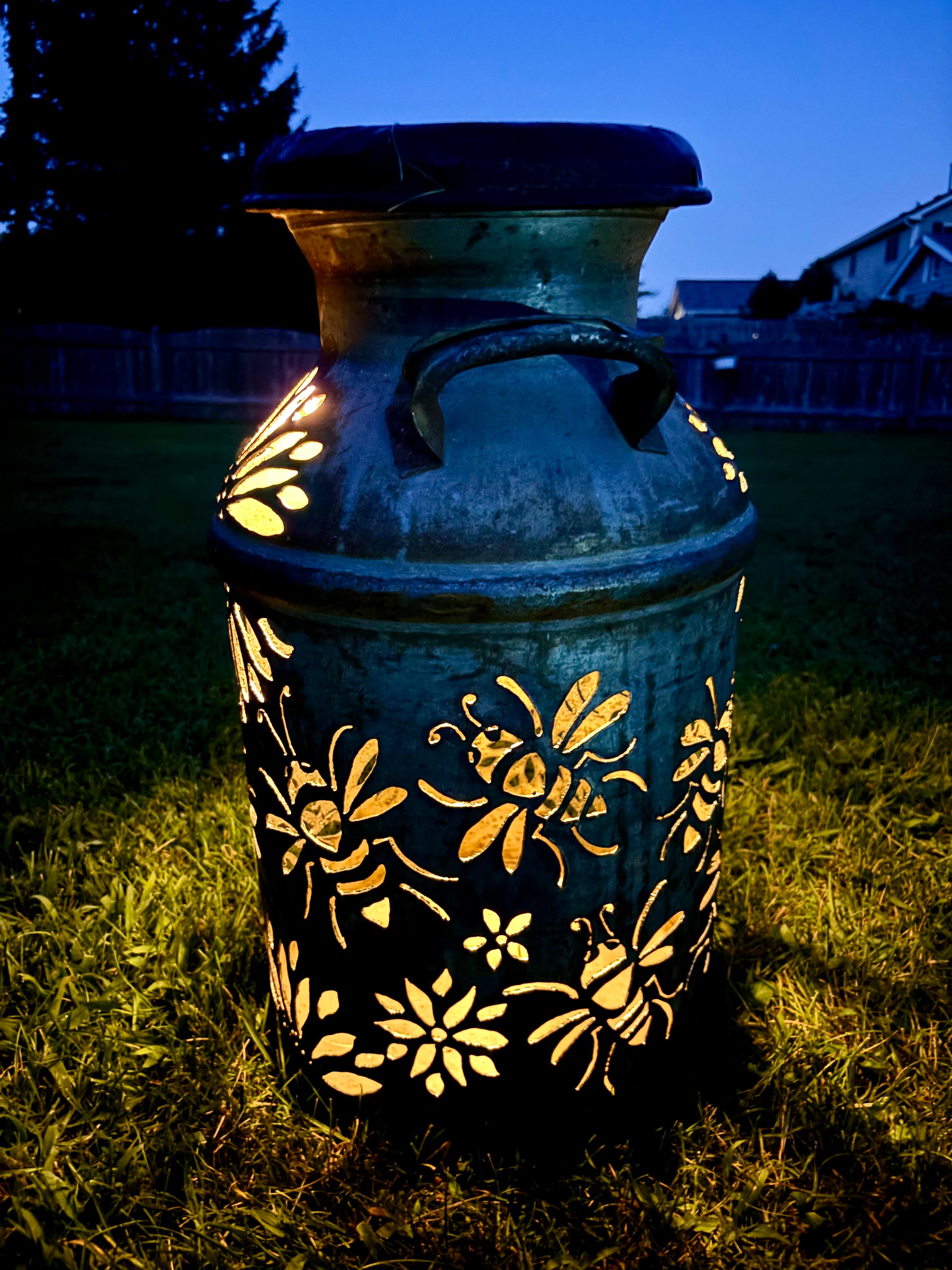 Brighten up your favorite spot with this intricately hand-cut vintage milk can with a bee and sunflower design.