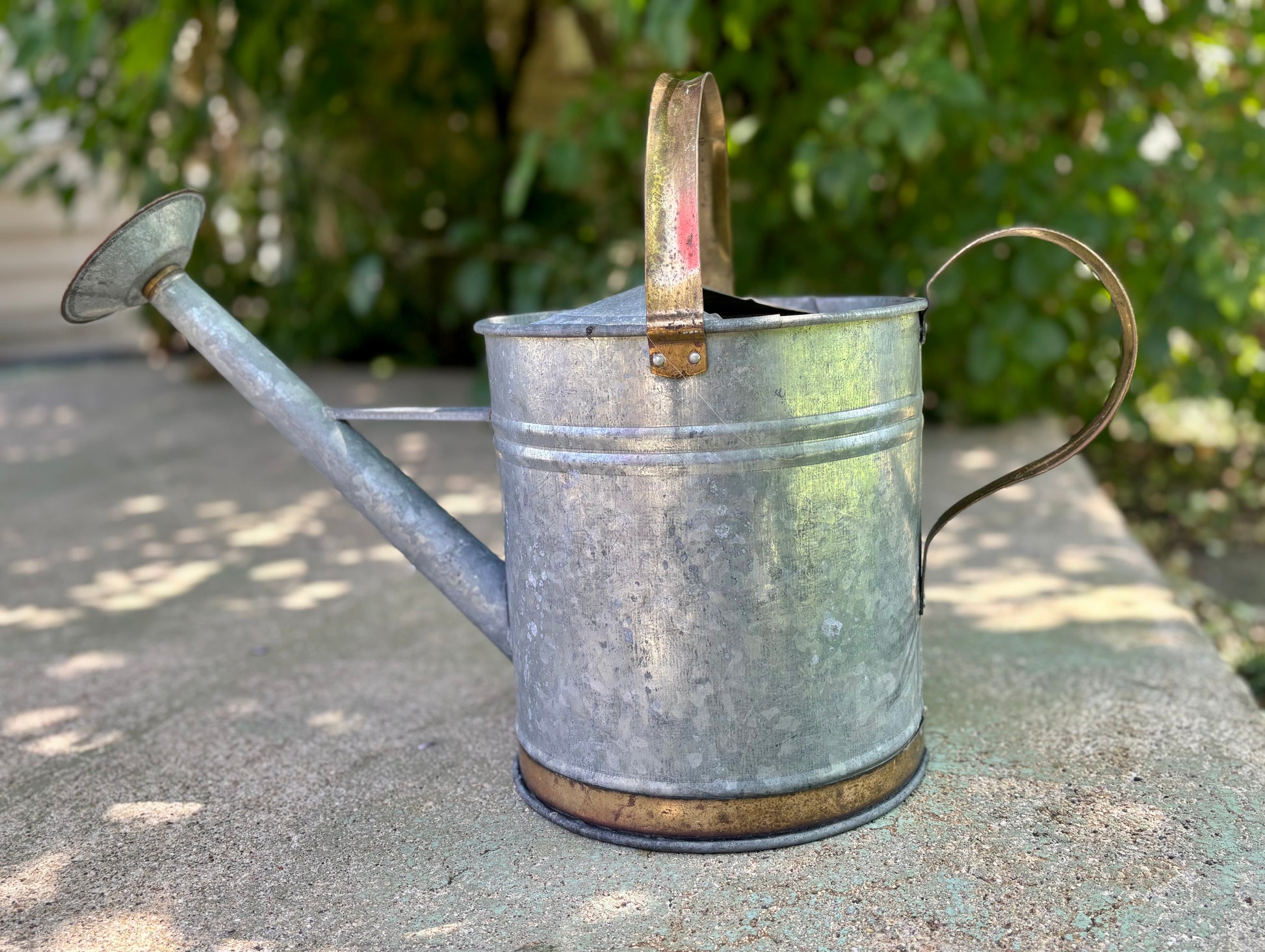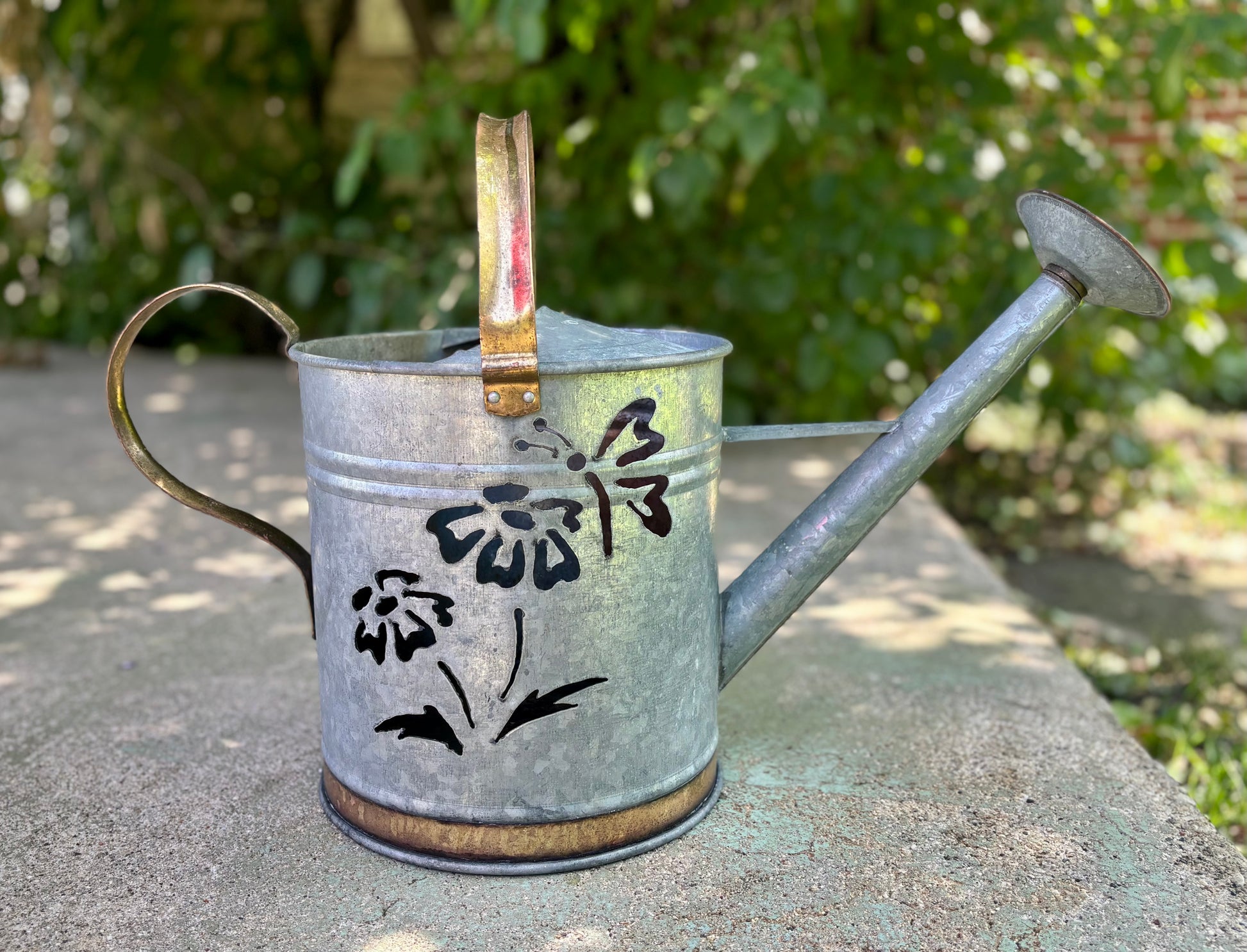 Antique watering can, handcrafted with a flower and butterfly design. This watering can has lovely metal accents at the handles, base, and spout.