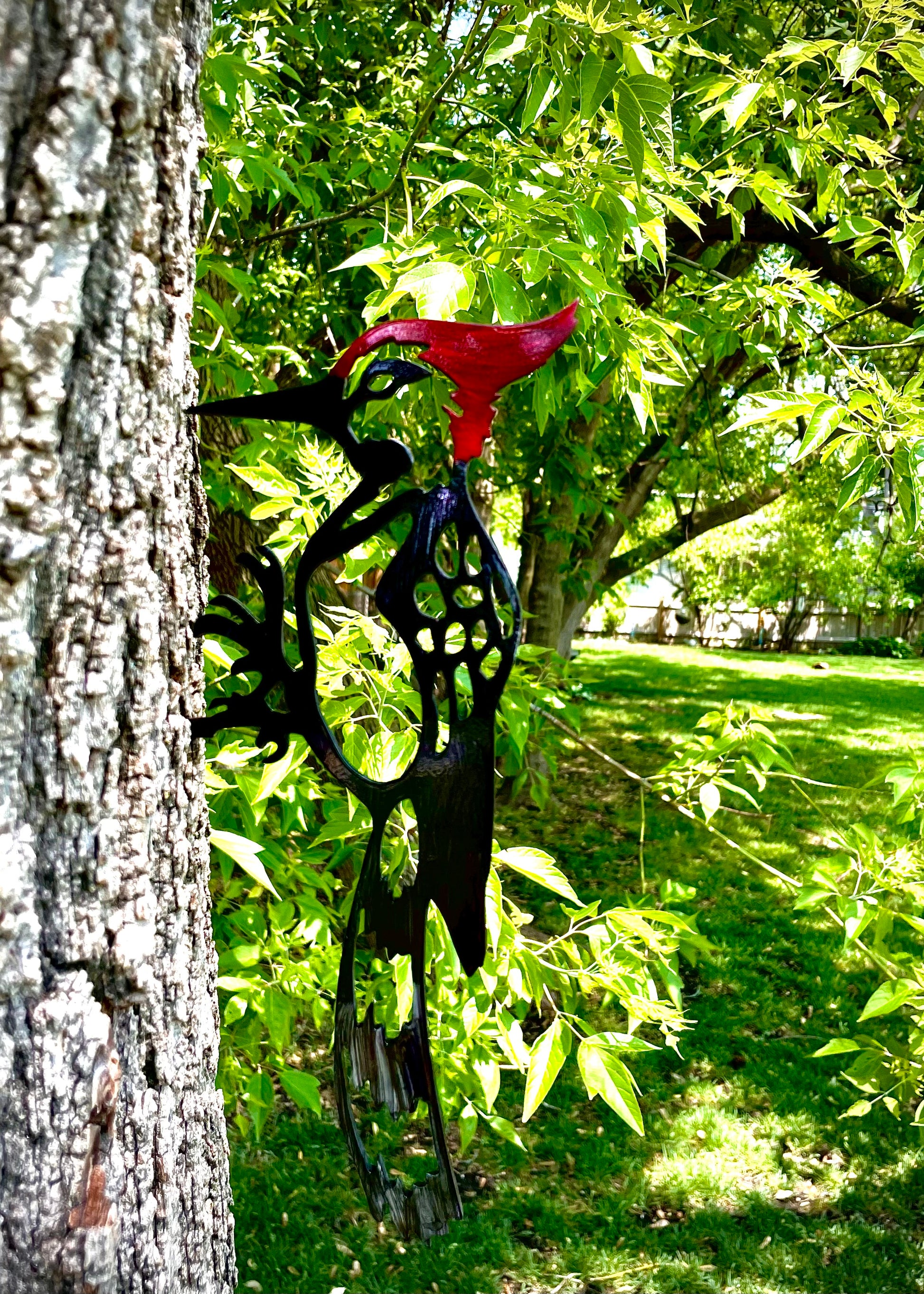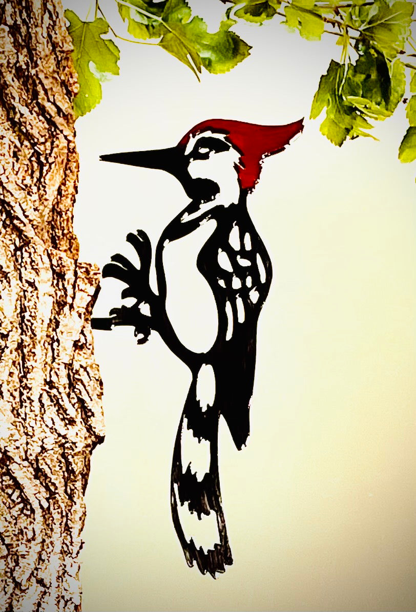 The woodpecker measures 6.48" wide and 11.46" tall. It is made with a minimum of 11-gauge metal or 1/8" thick.